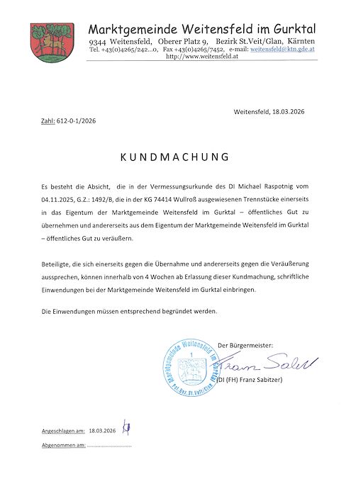 Kundmachung – Veräußerung und Übernahme öffentliches Gut